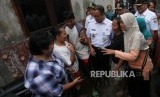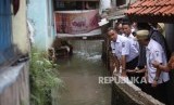 Gubernur DKI Jakarta Anies Baswedan berbincang dengan warga saat meninjau perbaikan tanggul Kali Pulo yang jebol akibat hujan ekstrem terjadi pada Senin (11/12) siang di Kelurahan Jatipadang, Pasar Minggu, Jakarta, Rabu (13/12). (FOTO : Republika/Mahmud Muhyidin)