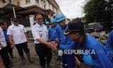 Gubernur DKI Jakarta Anies Baswedan menyampa pasukan biru saat meninjau perbaikan tanggul Kali Pulo yang jebol akibat hujan ekstrem terjadi pada Senin (11/12) siang di Kelurahan Jatipadang, Pasar Minggu, Jakarta, Rabu (13/12). (FOTO : Republika/Mahmud Muhyidin)