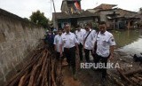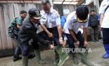 Gubernur DKI Jakarta Anies Baswedan menggunakan sepatu boot saat meninjau perbaikan tanggul Kali Pulo yang jebol akibat hujan ekstrem terjadi pada Senin (11/12) siang di Kelurahan Jatipadang, Pasar Minggu, Jakarta, Rabu (13/12). (FOTO : Republika/Mahmud Muhyidin)