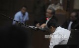 Terdakwa kasus dugaan korupsi KTP elektronik Setya Novanto duduk tertunduk di ruangan pada sidang perdana di gedung Pengadilan Tipikor Jakarta, Rabu (13/12). (FOTO : Republika/Iman Firmansyah)