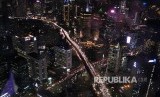 Kerlip lampu antrean kendaraan di atas jalan layang non tol (JLNT) Kampung Melayu di antara gedung bertingkat kawasan bisnis Jl Prof Dr Satrio Jakarta Selata, Selasa (12/12) malam. Hujan ekstrem yang melanda Jakarta memperparah kemacetan yang terjadi akibat pembangunan infrastruktur di kota ini. (FOTO : Yogi Ardhi/Republika)