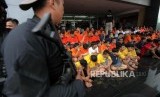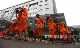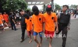 Petugas membawa tersangka seusai rilis operasi Premanisme di Polda Metro Jaya, Jakarta, Kamis (14/12). (FOTO : Republika/Mahmud Muhyidin)