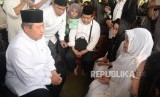 Presiden ke 6 Susilo Bambang Yudhoyono berbincang dengan keluarga Anggota DPD RI AM Fatwa di Rumah duka, Kawasan Pejaten, Jakarta, Kamis (14/12). (FOTO : Republika/Prayogi)