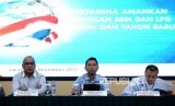 Kesiapan Jelang Libur Panjang. SVP Non Fuel Marketing Pertamina Persero Basuki Trikora Putra, VP Corporate Communication Pertamina Persero Adiatma Sardjito, dan SVP Fuel marketing and Distribution Pertamina Persero Gigih Wahyu Hari Irianto (dari kiri) saat konferensi pers di Kantor Pusat Pertamina, Jakarta, Jumat (15/12). (FOTO : Republika/ Wihdan)