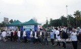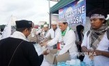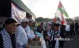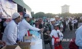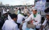 REPUBLIKA.CO.ID, JAKARTA -- Relawan membagikan makanan dan minuman kepada peserta aksi bela Palestina di kawasan Monas, Jakarta, Ahad (17/12).
