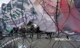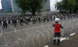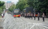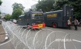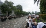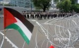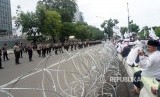 REPUBLIKA.CO.ID, JAKARTA -- Sejumlah personel kepolisian berjaga di depan Kedubes Amerika Serikat yang dipasangi pembatas kawat berduri saat berlangsungnya aski bela Palestina di kawasan Monas,Jakarta,Ahad (17/12).