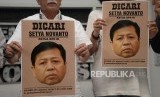 Narasumber menujukan poster DPO untuk Setya Novanto usai memberikan keterangan terkait hilangnya Ketua DPR Setya Novanto di Jakarta, Kamis (16/11). (FOTO : Republika/Prayogi)