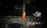 Jurnalis sedang memotret lokasi kejadian kecelakaan Setya Novanto di Jalan Permata Berlina, Jakarta Selatan, Kamis (11/06). Ketua DPR RI Setya Novanto mengalami kecelekaan yang dikabarkan saat menuju ke kantor KPK. (FOTO : Iman Firmansyah)