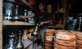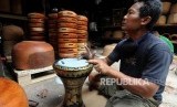 Perajin saat menabuh alat musik tumbuk pinggang yang siap untuk dijual di kawasan condet, Jakarta Timur, Kamis (28/12). (FOTO : Republika/Putra M. Akbar)