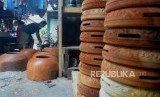 Perajin merapihkan bahan dasar alat musik rebana di kawasan condet, Jakarta Timur, Kamis (28/12). (FOTO : Republika/Putra M. Akbar)