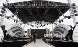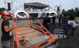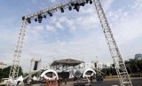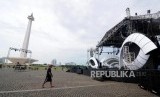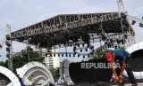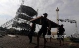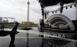REPUBLIKA.CO.ID, JAKARTA -- Pekerja melintasi panggung yang didirikan di kawasan Monas, Jakarta Pusat, Jumat (29/12). Pemerintah Provinsi (Pemprov) DKI Jakarta akan menggelar pesta rakyat dengan menampilkan acara musik di Monas dalam rangka menyambut tahun baru 2018.