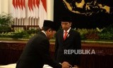 Kepala Badan Siber dan Sandi Negara Djoko Setiadi menandatangani naskah berita acara pelantikan Kepala BSSN oleh Presiden Joko Widodo di Istana Negara, Jakarta, Rabu (3/1). (FOTO : Republika/ Wihdan)