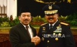 Kepala Badan Siber dan Sandi Negara Djoko Setiadi berjabat dengan Panglima TNI Hadi Tjahjanto (kanan) usai pelantikan oleh Presiden Joko Widodo di Istana Negara, Jakarta, Rabu (3/1). (FOTO : Republika/ Wihdan)