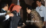 Terdakwa kasus tindak pidana korupsi KTP Elektronik Setya Novanto(Kiri) di dalam mobil usai mengikuti sidang lanjutan dengan agenda putusan sela di TIPIKOR, Jakarta, Kamis (4/1). (FOTO : Republika/Iman Firmansyah)