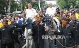 Pasangan calon gubernur dan wakil gubernur Jawa Barat Deddy Mizwar dan Dedi Mulyadi menunggang kuda saat menuju kantor KPU Jawa Barat, Kota Bandung, Selasa (9/1). (FOTO : Republika/Edi Yusuf)