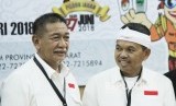 Pasangan Calon Gubernur dan Wakil Gubernur Jawa Barat Deddy Mizwar dan Dedi Mulyadi berbincang di sela-sela acara penyerahan berkas persyaratan pencalonan, di Kantor KPU Jawa Barat, Kota Bandung, Selasa (9/1). (FOTO : Republika/Edi Yusuf)