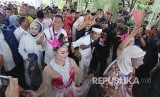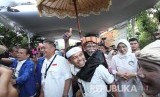 Pasangan Calon Gubernur dan Wakil Gubernur Jawa Barat Deddy Mizwar dan Dedi Mulyadi (menggendong pemain kesenian) saat mendatangi di Kantor KPU Jawa Barat, Kota Bandung, untuk menyerahkan berkas pencalonan, Selasa (9/1). (FOTO : Republika/Edi Yusuf)