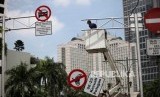 Petugas Dishub DKI Jakarta mencabut rambu-rambu larangan sepeda motor di kasawan Bundaran HI, Jakarta, Rabu (10/1). (FOTO : Republika/Mahmud Muhyidin)