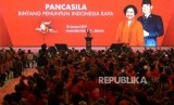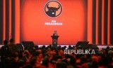 HUT PDI Perjuangan. Ketua Umum PDI Perjuangan Megawati Soekarnoputri memberikan arahan saat HUT ke-45 PDI Perjuangan di Balai Sidang Jakarta, Rabu (10/1). (FOTO : Republika/ Wihdan)