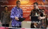 Perjanjian Kerjasama. Direktur Utama Jaminan Pembiayaan Askrindo Syariah, Pribadi ( kedua kiri), Direktur Syariah Banking Bank CIMB Niaga Pandji P Djajanegara ( kedua kanan) bertukar draft saat melakukan penadatanganan kerjasama perjanjian pembiayaan (Kafalah) di Jakarta, Jumat (12/1). (FOTO : Tahta Aidilla/Republika)