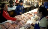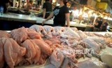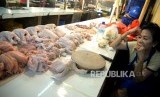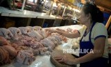 REPUBLIKA.CO.ID, JAKARTA -- Pedagang melayani pembeli daging ayam potong di Pasar Senen, Jakarta, Ahad (14/1).