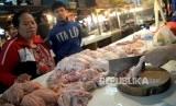 Pedagang melayani pembeli daging ayam potong di Pasar Senen, Jakarta, Ahad (14/1). (FOTO : Republika/ Wihdan)