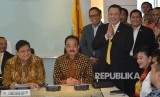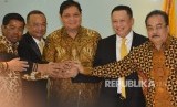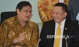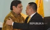 REPUBLIKA.CO.ID, JAKARTA -- Ketua Umum Partai Golkar Airlangga Hartarto menyalami calon Ketua DPR dari Fraksi Golkar Bambang Soesatyo sebelum memberikan keterangan kepada wartawan terkait pengumuman calon ketua DPR dari Fraksi Golkar di Kompleks Parlemen, Senayan, Jakarta, Senin (15/1).