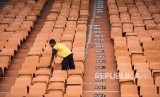 REPUBLIKA.CO.ID, BANDUNG -- Pekerja memeriksa kondisi bangku sebelum direnovasi di Stadion Si Jalak Harupat, Kabupaten Bandung, Jawa Barat, Jumat (19/1).