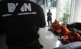 Anggota BNN menjaga 4 tersanggka yang di tangkap oleh BNN dan Bea Cukai dalam kofrensi pers di kantor Bea dan Cukai, Jakarta,Jumat (19/1). (FOTO : Republika/Iman Firmansyah)