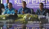 Kepala BNN Budi Waseso (kiri) memberikan barang bukti kepada ke 4 tersangka dengan inisial AM,HR, JN, dam SN dalam kofrensi pers di kantor Bea dan Cukai, Jakarta,Jumat (19/1). (FOTO : Republika/Iman Firmansyah)