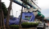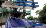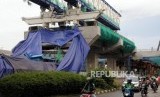 Pekerja mengecek kondisi konstruksi proyek Light Rapid Transit (LRT) yang roboh di kawasan Jalan Raya Kayu Putih, Pulogadung, Jakarta Timur, Senin (22/1). (FOTO : Republika/Putra M. Akbar)