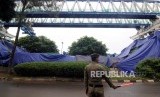Petugas Satpol PP mengatur lalu lintas imbas dari peristiwa konstruksi proyek Light Rapid Transit (LRT) yang roboh di kawasan Jalan Raya Kayu Putih, Pulogadung, Jakarta Timur, Senin (22/1). (FOTO : Republika/Putra M. Akbar)