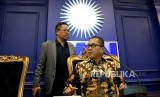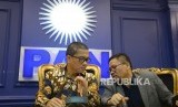 Sekretaris Fraksi PAN Yandri Susanto (kanan) bersama anggota Komisi III Fraksi PAN Daeng Muhammad menggelar konferensi pers perkembangan terkini di Kompleks Parlemen Senayan, Jakarta, Senin (22/1). (FOTO : Republika/ Wihdan)