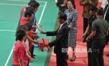 Presiden Joko Widodo memberikan raket kepada para pemain bulutangkis legendaris Indonesia saat meresmikan renovasi Istana Olahraga (Istora) di kawasan Gelora Bung Karno (GBK) Jakarta, sore ini, Selasa (23/1). (FOTO : Republika/Edwin Dwi Putranto)