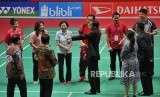Presiden Joko Widodo berbincang dengan para pemain bulutangkis legendaris Indonesia saat meresmikan renovasi Istana Olahraga (Istora) di kawasan Gelora Bung Karno (GBK) Jakarta, sore ini, Selasa (23/1). (FOTO : Republika/Edwin Dwi Putranto)
