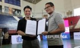 Wakil Gubernur DKI Jakarta Sandiaga Uno (kanan) memperlihatkan bersama NBA Associate Vice President of Marketing Partnerships Jim Wong (kiri) memperlihatkan nota kerjasama saat pembukaan Akademi Pelatih Jr. NBA di GOR Caracas, Jakarta, Rabu (24/1). (FOTO : Republika/Mahmud Muhyidin)