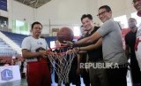 Wakil Gubernur DKI Jakarta Sandiaga Uno (kiri) bersiap memasukan bola ring sebagai simbolis saat pembukaan Akademi Pelatih Jr. NBA di GOR Caracas, Jakarta, Rabu (24/1). (FOTO : Republika/Mahmud Muhyidin)