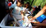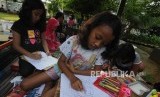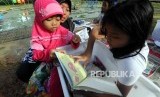 Sejumlah anak-anak mengikuti kegiatan belajar sambil bermain yang diselenggarakan oleh Perpustakaan Keliling Yayasan Pustaka Kelana di Taman Pintar, Pulogadung, Jakarta, Rabu (24/1). (FOTO : Republika/Putra M. Akbar)