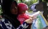 Warga membacakan dongeng kepada anaknya dari buku yang dibawa oleh Perpustakaan Keliling Yayasan Pustaka Kelana di Taman Pintar, Pulogadung, Jakarta, Rabu (24/1). (FOTO : Republika/Putra M. Akbar)