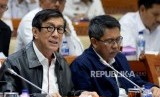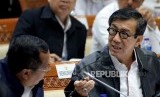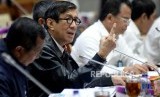 REPUBLIKA.CO.ID, JAKARTA -- Menteri Hukum dan HAM Yasonna Laoly menyampaikan pendapatnya dalam rapat kerja dengan Komisi III DPR di Komplek Parlemen, Senayan, Jakarta, Kamis (25/1).