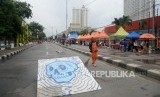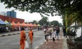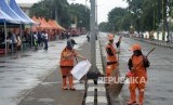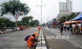 Petugas PPSU Kelurahan Sunter jaya membersihkan sampah usai diadakanya Hari Bebas Kendaraan Bermotor (HBKB) di Jalan Danau Sunter Selatan, Jakarta Utara, Ahad (28/1). (FOTO : Republika/Prayogi)