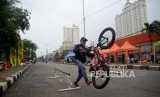 Warga beratraksi sepeda BMX ketika berlangsungya Hari Bebas Kendaraan Bermotor (HBKB) di Jalan Danau Sunter Selatan, Jakarta Utara, Ahad(28/1). (FOTO : Republika/Prayogi)