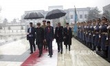 Presiden Jokowi memeriksa pasukan kehormatan saat tiba di Istana Presiden, Kabul, Senin (29/1). (FOTO : AP/Massoud Hossaini)