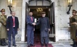Presiden Afghanistan Ashraf Ghani menyambut kedatangan Presiden Jokowi di Istana Presiden, Kabul, Senin (29/1). (FOTO : AP/Massoud Hossaini)