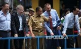 Gubernur DKI Jakarta Anies Baswedan (tengah) bersama Dubes Denmark Rasmus A Kristensen (kiri) dan Dubes Norwegia Vegard Kalee (kanan) meninjau kondisi sampah di Pintu Air Manggarai, Jakarta, Selasa (30/1). (FOTO : Republika/Mahmud Muhyidin)