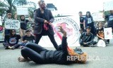 Aksi teaterikal yang menggembarkan penderitaan monyet yang dipekerjakan saat aksi Air Mata Topeng Monyet yang digelar Jakarta Animal Aid Network (JAAN) dalam rangka Peringatan Hari Primata Nasional, di depan Gedung Sate, Kota Bandung, Selasa (30/1). (FOTO : Republika/Edi Yusuf)