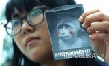 Seorang peserta aksi memperlihatkan poster saat aksi Air Mata Topeng Monyet yang digelar Jakarta Animal Aid Network (JAAN) dalam rangka Peringatan Hari Primata Nasional, di depan Gedung Sate, Kota Bandung, Selasa (30/1). (FOTO : Republika/Edi Yusuf)