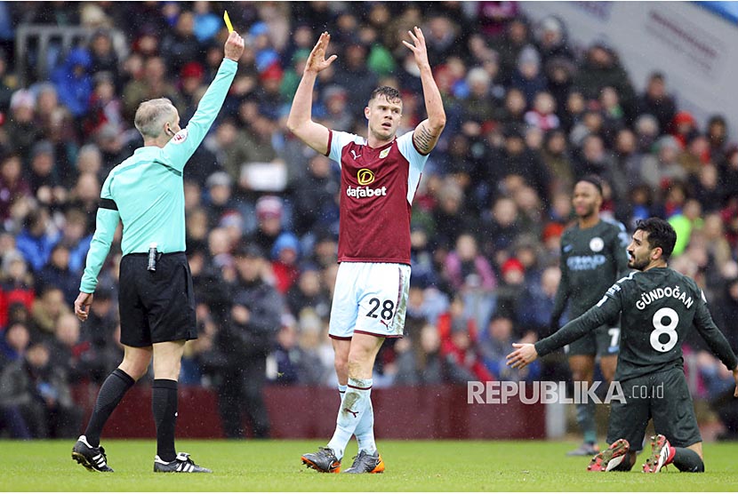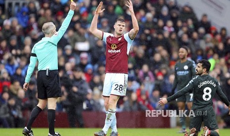 Ekspresi Kevin Long saat menerima kartu kuning pada pertandingan Burnley vs Manchester City di Turf Moor, Burnley, Sabtu (3/2). (FOTO : Richard Sellers/AP)