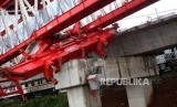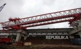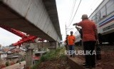 Petugas memperiksa kondisi crane proyek pembangunan kontruksi jalur kereta ”double-dobel track (DDT)" yang roboh di Matraman, Jakarta, Ahad (4/2). (FOTO : Republika/Mahmud Muhyidin)