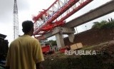 Warga mengamati kondisi crane proyek pembangunan kontruksi jalur kereta ”double-dobel track (DDT)" yang roboh di Matraman, Jakarta, Ahad (4/2). (FOTO : Republika/Mahmud Muhyidin)